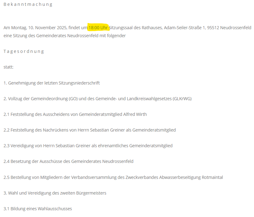 Die Sitzung findet nicht wie üblich um 19:00 Uhr statt.